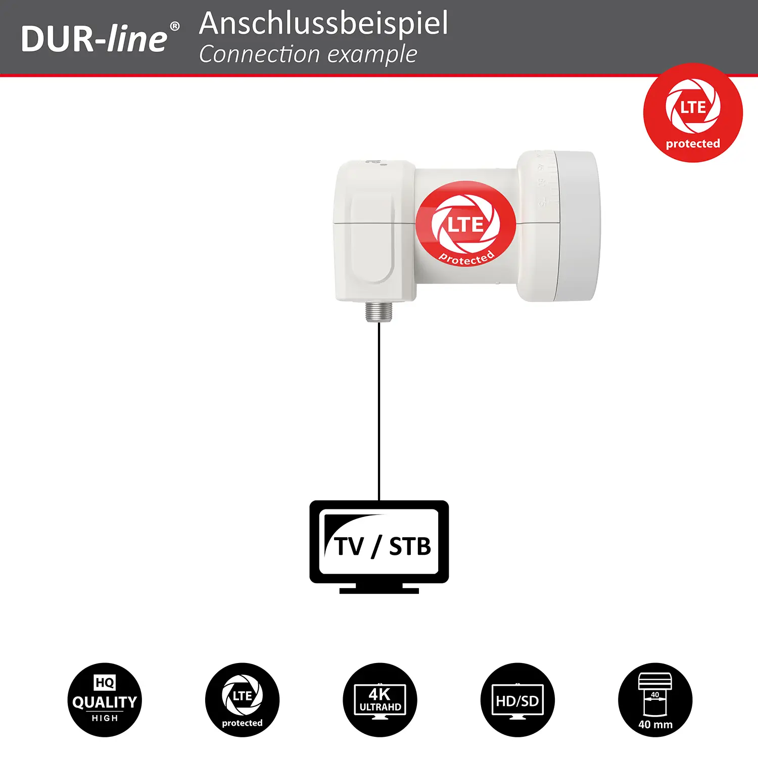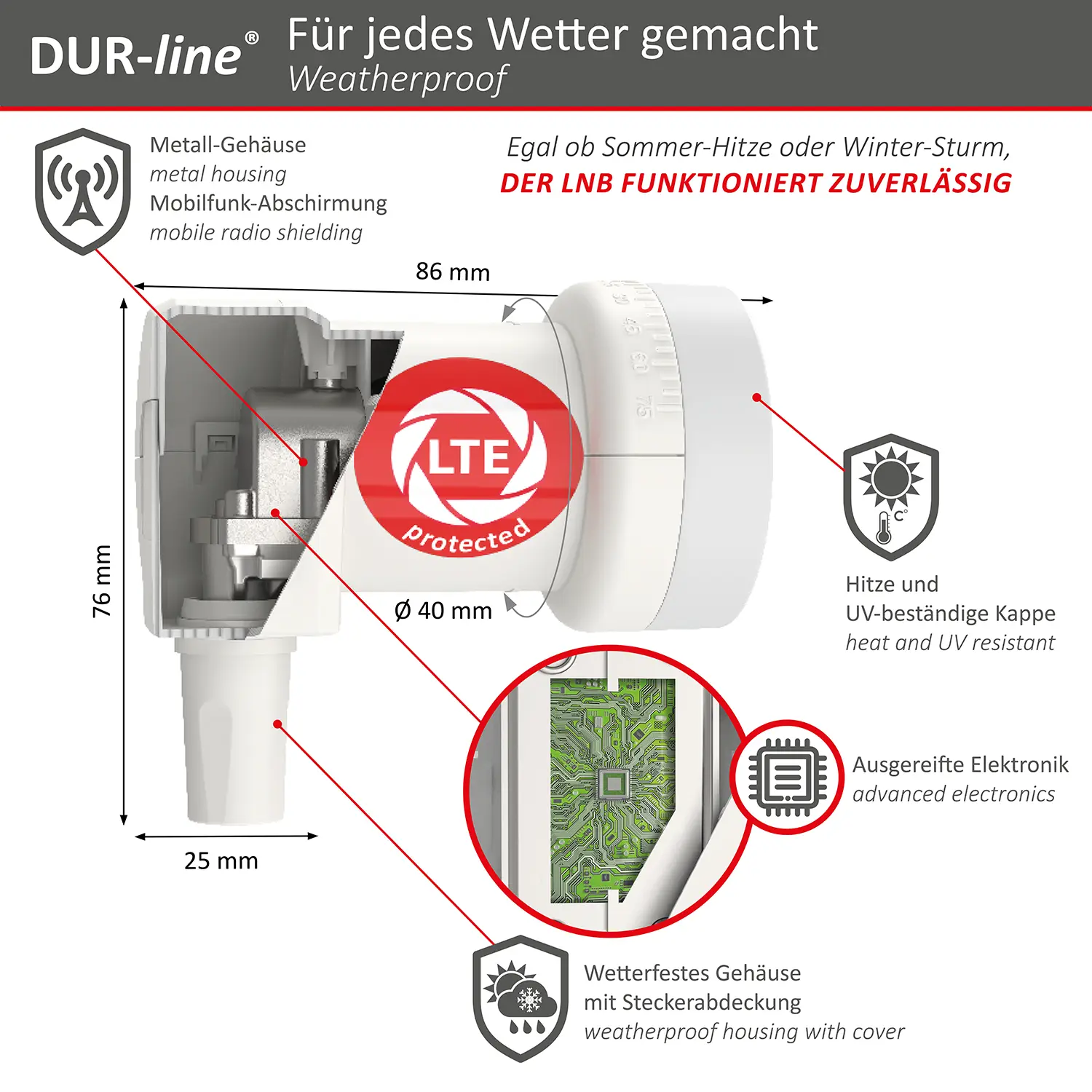 Die DUR-line LNB „+ Ultra" Serie zeichnet sich durch eine extreme Witterungsbeständigkeit aus. Egal ob tiefste Temperaturen oder größte Hitze. Eine reibungslose Funktion ist immer garantiert. Diese LNBs bieten eine ausgereifte Technologie für beste Bild- und Tonqualität.