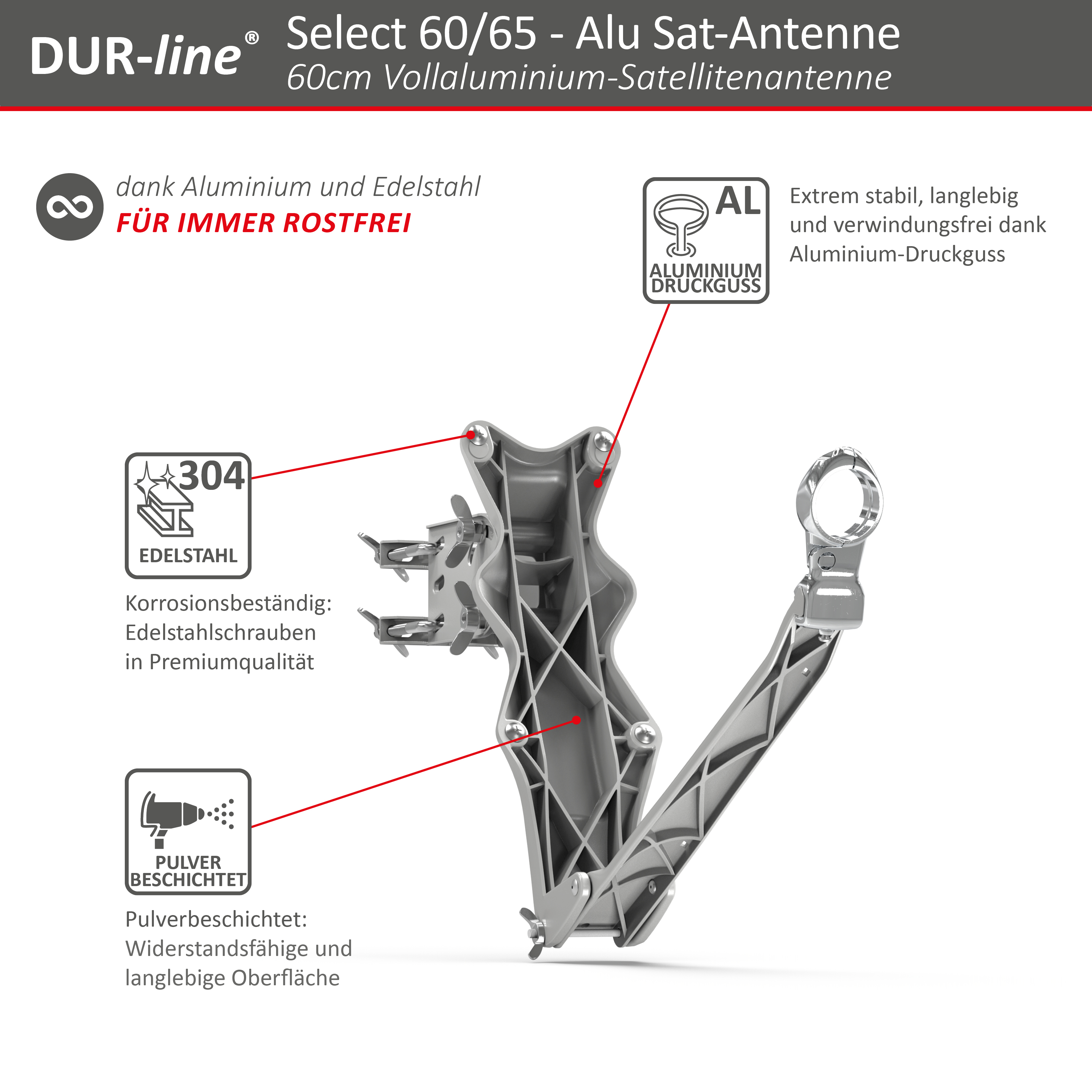 - Hochwertige Marken-Satellitenschüssel von DUR-line – Qualität die jedem Sturm trotzt und dass Jahrzehnte lang!